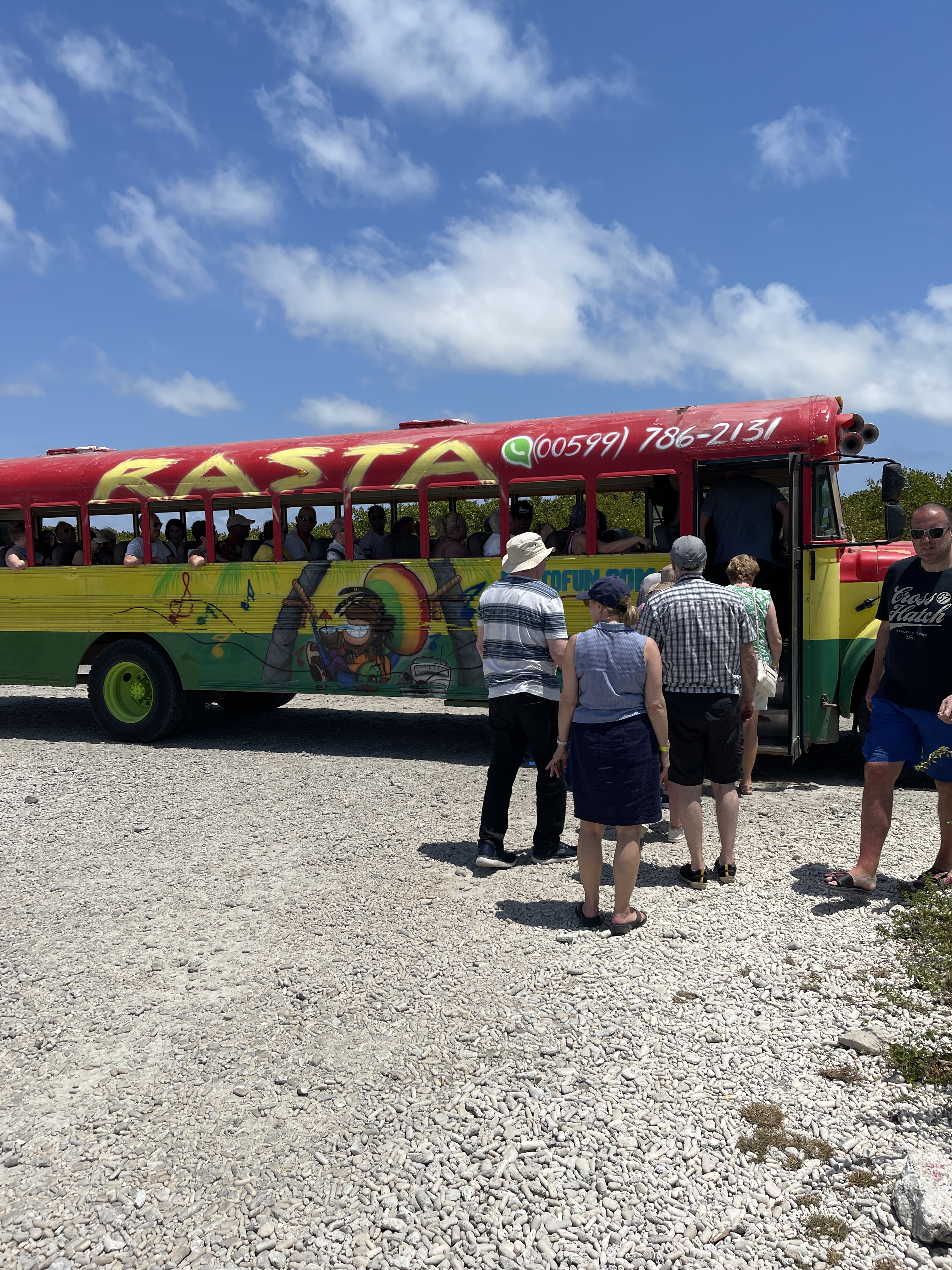 As luck would have it, our tour didn’t actually start until11:30 so a relaxed breakfast it was 👍 before gathering our stuff and heading ashore to meet our ‘Rasta Bus’ with natural air conditioning (no glass in the windows).
