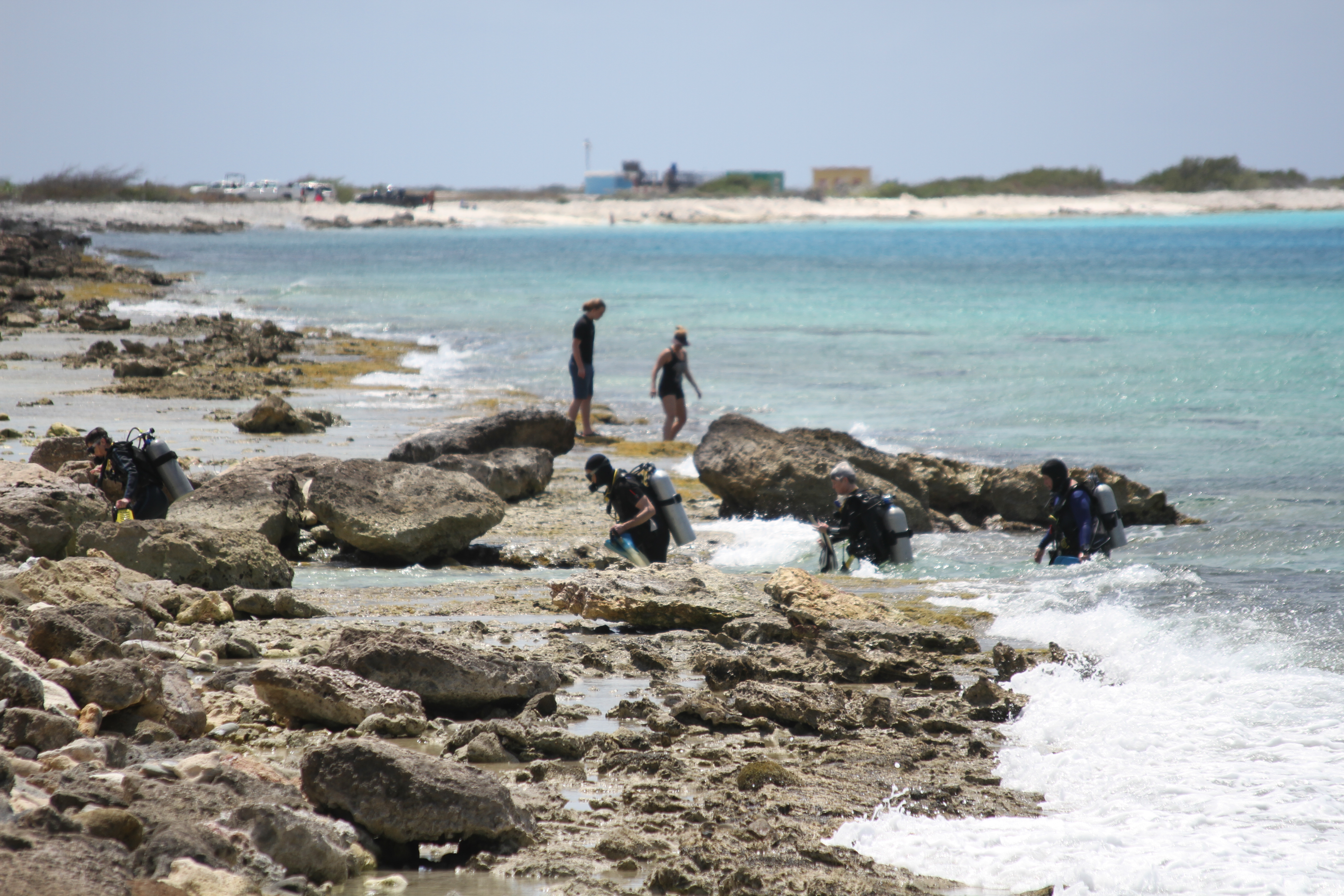 Our journey took us past Salt Pier down to the southern end of the island. While exploring the shores of Salt Pier, We didn’t actually go on to the salt pier but in the distance we were able to see lorries etc, collecting and loading the salt but, The Duchess had her eyes on the ground and espied a lovely piece of rock which would look nice back home with her garden collection of other rocks and stones (don’t ask). The rock was subsequently secreted into her bag and we made our way back to the bus. As we set off further south, our guide casually mentioned that collecting rocks, fossils, etc, from the beaches of Bonaire was highly illegal. This worried The Duchess immensely though His Podgeness thought it hilarious. So worried was The Duchess however that she immediately took her contraband back ashore and replaced it as discreetly as she could after which His Podgeness announced to all on the bus that the contraband had been returned, for which His Podgeness got a thick ear, again (poor Podge). Before leaving however, we spotted a number of Scuba Divers, or whatever they are called, walking out of the sea and onto the beach (not something one normally see’s).