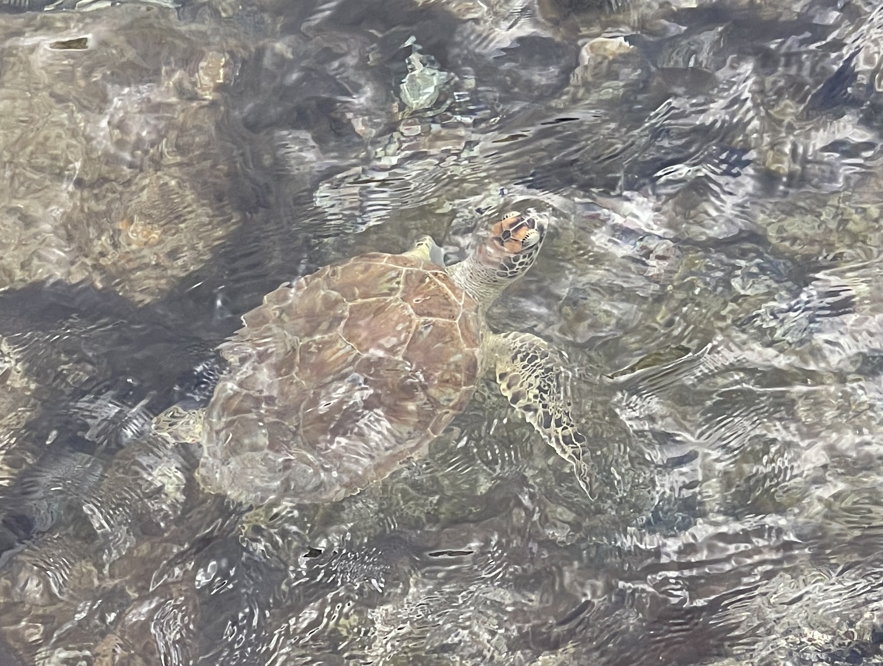 After a plate of Tuna / Salmon open sandwiches (I’m not sure if that’s what they’re really called) and a couple of nice cold beers we headed back to the ship, stopping on the way to espy a turtle who was swimming in the rocks right next to the walkway. The Duchess was convinced it was stuck on the rocks and needing rescuing though Podge did manage to convincer her that the turtle was in fact ok: Let’s be honest, we all know that The Duchess just wanted to hold the turtle. Fortunately, a passing local convinced hee=r that it was all ok and that in fact the turtle was often seen there.