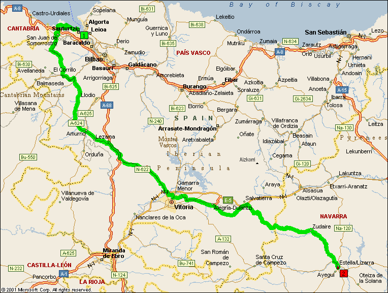 As the boat was due to dock at some unearthly hour, everybody had to be up at crack of dawn, UK time – crack of mid-morning Spanish time!! All the riders disembarked to scheduled and headed out to greet the Support Crew, who were late disembarking due to broken down car holding up proceedings. The riders negotiated with a taxi driver to take them to Bedia with the Espace following as close as they could. On reflection, it did look as though the decision not cycle out of Bilbao was a wise one.
